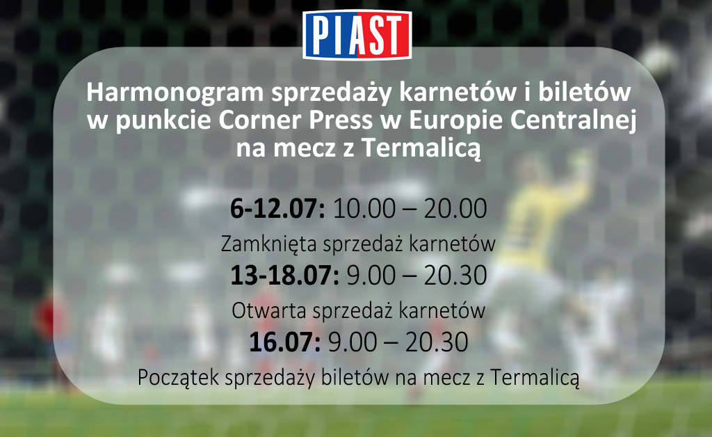 Prezentujemy harmonogram sprzedaży karnetów na I rundę zasadniczą Ekstraklasy. Od 6 do 12 lipca prowadzona będzie zamknięta sprzedaż karnetów, a więc dla posiadaczy stałych wejściówek w II rundzie zasadniczej i finałowej sezonu 2014/2015. W poniedziałek 13 lipca rozpocznie się sprzedaż dla wszystkich kibiców chcących nabyć karnet i potrwa do meczu z Legią Warszawa. Tego dnia ruszy również sprzedaż internetowa karnetów. Od 16 lipca będzie można kupić bilety na spotkanie ligowe z Termalicą Bruk-Bet Nieciecza. Cennik biletów oraz karnetów zostanie podany wkrótce. Szczegółowy harmonogram zamieszony jest poniżej.